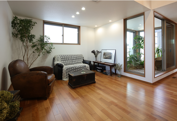 リビングとサンルームを隣接させ、庭につなげ、居心地の良い空間に。