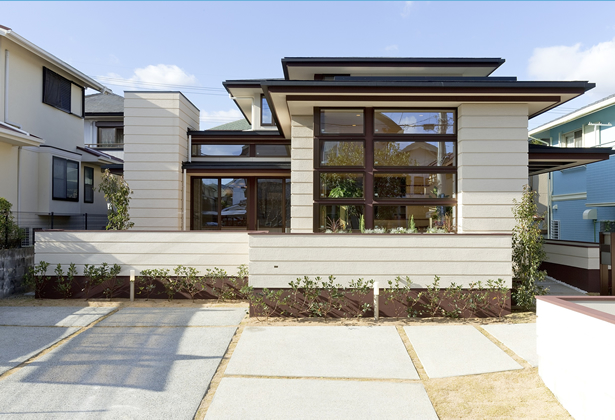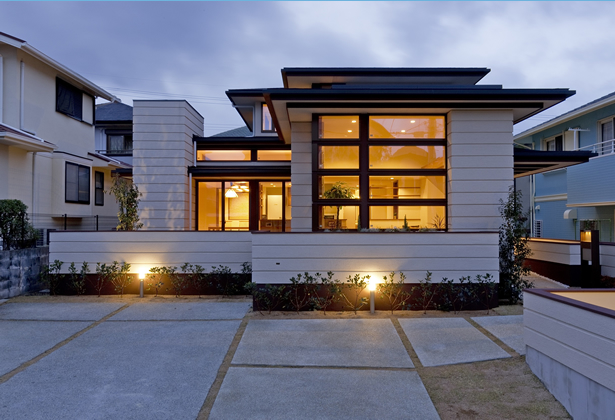 フランク・ロイド・ライトの代表的なユーソニアンハウスで用いられた、庭を囲むL字型プランをベースに、住宅と庭の一体化、自然と人と時間のつながりを現代風にアレンジしたデザイン住宅。