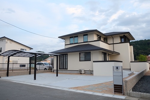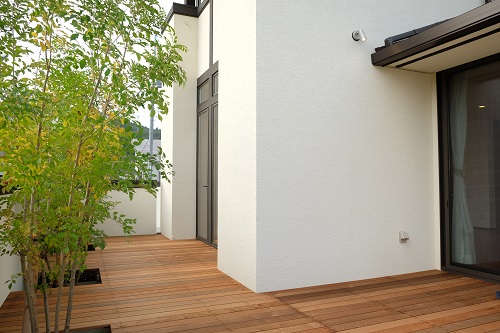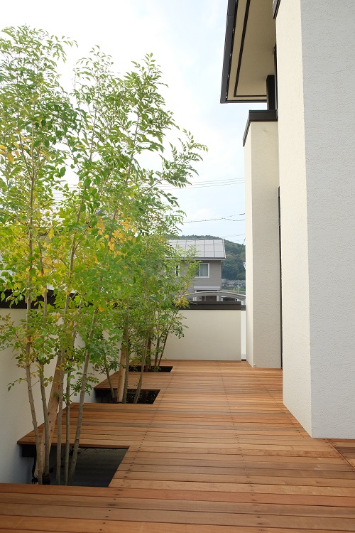 久米南K様 2019年08月28日 久米南K様邸 【シリーズオークパーク】「重厚感のある佇まいや構造の頑丈さなどとても魅力的で、10 分で決心するほどの、衝撃的な出会いでした。」とKさま。リビングから繋がる、常緑樹のある広々としたウッドデッキ。伸びやかな水平ラインが強調された、シンプルでいて高級感のある外観。K 様が最も気に入っているところだそう。家族が心地よく繋がる変形のLDK。ダイニングとリビングを対角に配置し、空間にさらなる広がりを持たせました。